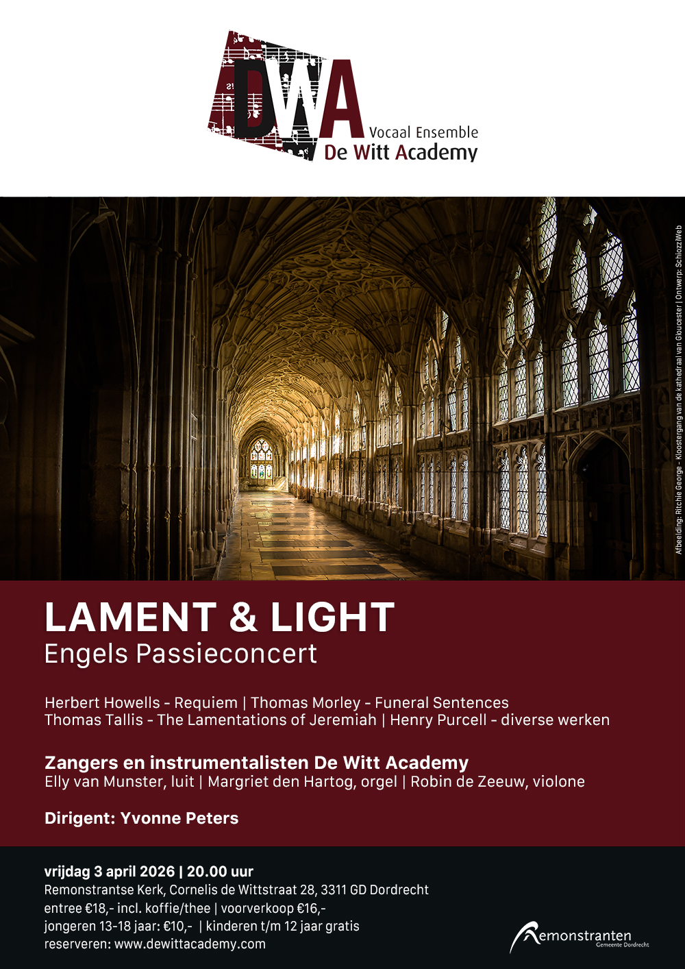 De Witt Academy is een projectkoor en bestaat uit geschoolde zangers, die allen een grote koorervaring hebben. De bezetting is afhankelijk van de uit te voeren muziek. Jaarlijks hebben wij gemiddeld twee projecten, in het najaar en in het voorjaar. Het concert in het voorjaar is traditiegetrouw een Passieconcert op Goede Vrijdag of Stille Zaterdag in de Remonstrantse Kerk. De najaarsconcerten zijn op wisselende lokatie in en rondom Dordrecht.